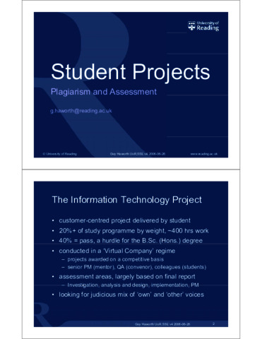 Within the Information Technology degree programme of the University of Reading, the students undertake a major project in their final year. The module is both a hurdle to an honours degree and significant in terms of assessment weighting. The two year history so far has shown that bad citation and plagiarism are issues, and in one case called for the due referral of a project report. In the light of experience to date, we are focusing firstly on plagiarism prevention, giving generic advice on report writing and citation practice, and secondly on detection. In the longer term, I believe we need to reflect on what capabilities we should be creating in our undergraduates and therefore what and how we should be assessing them.