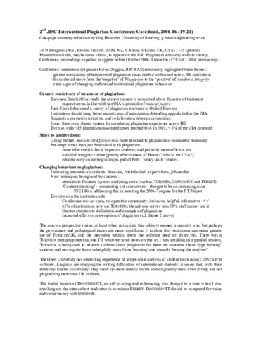 In: JISC 2nd International Plagiarism Conference 2006, 19th - 21st May, 2006, The sage, Gateshead, Newcastle.