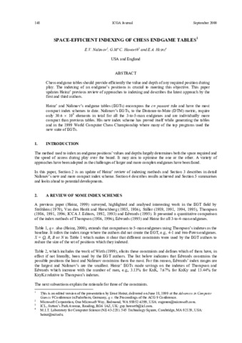 Heinz, E.A. (1999). Endgame Databases and Efficient Index Schemes for Chess. ICCA Journal, Vol. 22, No. 1, pp. 22-32.