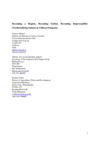 Blanco, G., Arce, A. and Fisher, E. (2015) Becoming a region, becoming global, becoming imperceptable: territorialising salmon in Chilean Patagonia. Journal of Rural Studies, 42. pp. 179-190. ISSN 0743-0167 doi: 10.1016/j.jrurstud.2015.10.007