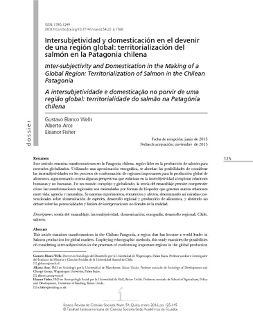 Wells, G. B., Arce, A. and Fisher, E. (2016) Intersubjetividad y domesticación en el devenir de una región global: la territorialización del salmón en la Patagonia chilena. ICONOS Revista de Ciencias Sociales, 20 (54). pp. 125-144. ISSN 1390-8065