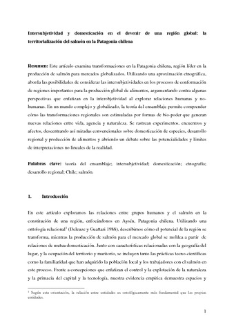 Este artículo examina transformaciones en la Patagonia chilena, región líder en la producción de salmón para mercados globalizados. Utilizando una aproximación etnográfica, aborda las posibilidades de considerar las intersubjetividades en los procesos de conformación de regiones importantes para la producción global de alimentos, argumentando contra algunas perspectivas que enfatizan en la interobjetividad al explorar relaciones humanas y no-humanas. En un mundo complejo y globalizado, la teoría del ensamblaje permite comprender cómo las transformaciones regionales son estimuladas por formas de bio-poder que generan nuevas relaciones entre vida, agencia y naturaleza. Se rastrean experimentos, encuentros y afectos, descentrando así miradas convencionales sobre domesticación de especies, desarrollo regional y producción de alimentos y abriendo un debate sobre las potencialidades y límites de interpretaciones no lineales de la realidad.