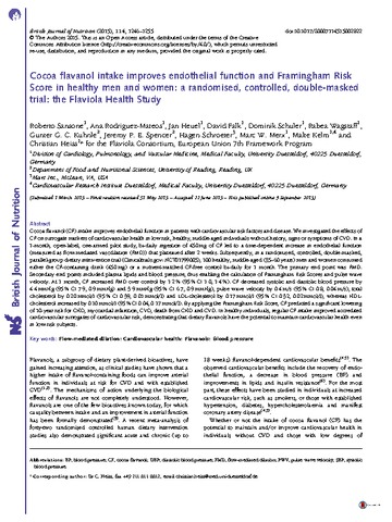 Cocoa flavanol intake improves endothelial function and Framingham Risk Score in healthy men and women: a randomised, controlled, double-masked trial: the Flaviola Health Study.
