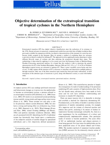 Studholme, J., Hodges, K. I. orcid id iconORCID: https://orcid.org/0000-0003-0894-229X and Brierley, C. M. (2015) Objective determination of the extratropical transition of tropical cyclones in the Northern Hemisphere. Tellus Series A: Dynamic Meteorology and Oceanography, 67. 24474. ISSN 0280-6495 doi: 10.3402/tellusa.v67.24474