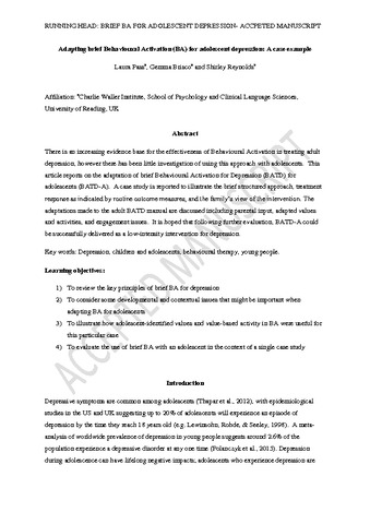 Adapting brief Behavioural Activation (BA) for adolescent depression: a case example