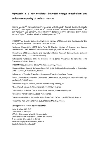 Mouisel, E., Relizani, K., Mille-Hamard, L., Denis, R., Hourde, C., Agbulut, O., Patel, K., Arandel, L., Morales-Gonzalez, S., Vignaud, A., Garcia, L., Ferry, A., Luquet, S., Billat, V., Ventura-Clapier, R., Schuelke, M. and Amthor, H. (2014) Myostatin is a key mediator between energy metabolism and endurance capacity of skeletal muscle. American Journal of Physiology: Regulatory Integrative and Comparative Physiology, 307 (4). R444-R454. ISSN 0363-6119 doi: 10.1152/ajpregu.00377.2013