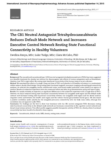 Resting-state functional connectivity following a single dose treatment with CB1 neutral antagonist tetrahydrocannabivarin (THCv) in healthy volunteers.