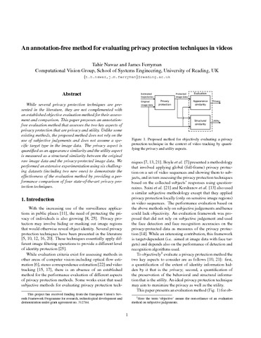 Nawaz, T. and Ferryman, J. (2015) An annotation-free method for evaluating privacy protection techniques in videos. In: 12th IEEE International Conference on Advanced Video- and Signal-based Surveillance (AVSS2015), August 25-28, 2015, Karlsruhe, Germany, pp. 1-6.