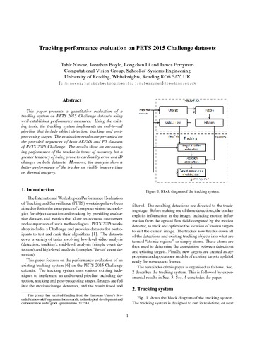 This paper presents a quantitative evaluation of a tracking system on PETS 2015 Challenge datasets using well-established performance measures. Using the existing tools, the tracking system implements an end-to-end pipeline that include object detection, tracking and post- processing stages. The evaluation results are presented on the provided sequences of both ARENA and P5 datasets of PETS 2015 Challenge. The results show an encouraging performance of the tracker in terms of accuracy but a greater tendency of being prone to cardinality error and ID changes on both datasets. Moreover, the analysis show a better performance of the tracker on visible imagery than on thermal imagery.