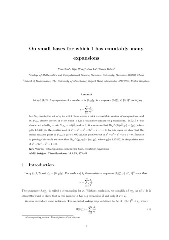 Zou, Y., Wang, L., Lu, J. and Baker, S. (2016) On small bases for which 1 has countably many expansions. Mathematika, 62 (2). pp. 362-377. ISSN 0025-5793 doi: 10.1112/S002557931500025X