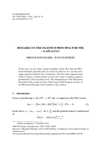 Katzourakis, N. and Manfredi, J. (2016) Remarks on the validity on the maximum principle for the ∞-Laplacian. Le Matematiche, 71. pp. 63-74. ISSN 2037-5298 doi: 10.4418/2016.71.1.5