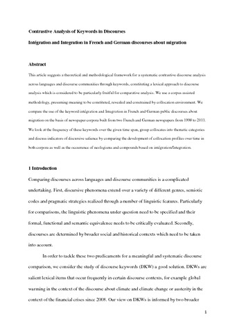 This article suggests a theoretical and methodological framework for a systematic contrastive discourse analysis across languages and discourse communities through keywords, constituting a lexical approach to discourse analysis which is considered to be particularly fruitful for comparative analysis. We use a corpus assisted methodology, presuming meaning to be constituted, revealed and constrained by collocation environment. We compare the use of the keyword intégration and Integration in French and German public discourses about migration on the basis of newspaper corpora built from two French and German newspapers from 1998 to 2011. We look at the frequency of these keywords over the given time span, group collocates into thematic categories and discuss indicators of discursive salience by comparing the development of collocation profiles over time in both corpora as well as the occurrence of neologisms and compounds based on intégration/Integration.