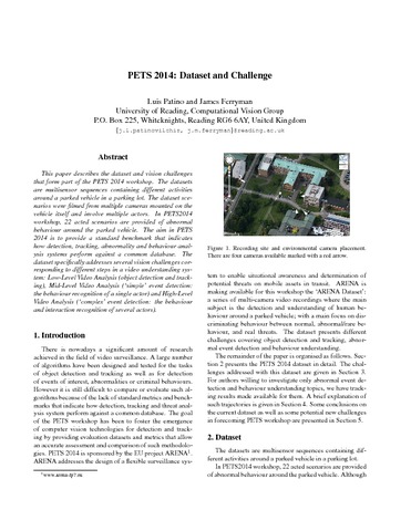 This paper describes the dataset and vision challenges that form part of the PETS 2014 workshop. The datasets are multisensor sequences containing different activities around a parked vehicle in a parking lot. The dataset scenarios were filmed from multiple cameras mounted on the vehicle itself and involve multiple actors. In PETS2014 workshop, 22 acted scenarios are provided of abnormal behaviour around the parked vehicle. The aim in PETS 2014 is to provide a standard benchmark that indicates how detection, tracking, abnormality and behaviour analysis systems perform against a common database. The dataset specifically addresses several vision challenges corresponding to different steps in a video understanding system: Low-Level Video Analysis (object detection and tracking), Mid-Level Video Analysis (‘simple’ event detection: the behaviour recognition of a single actor) and High-Level Video Analysis (‘complex’ event detection: the behaviour and interaction recognition of several actors).