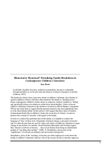 Broad, S. E. (2009) Historical or hysterical? Periodising family breakdown in contemporary children’s literature. IBBYlink, 25. pp. 3-5.
