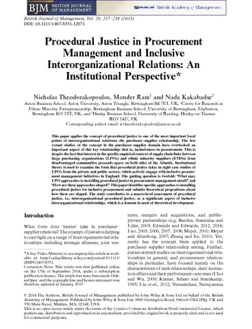 This paper applies the concept of procedural justice to one of the most important focal points of interorganizational relations: the purchaser–supplier relationship. The few extant studies of the concept in the purchaser–supplier domain have overlooked an important aspect of this key relationship: that is, inclusiveness in procurement. This is despite the fact that interest in the specific empirical context of supply chain links between large purchasing organizations (LPOs) and ethnic minority suppliers (EMSs) from disadvantaged communities proceeds apace on both sides of the Atlantic. Institutional theory is used to examine the form that procedural justice takes in eight case studies of LPOs from the private and public sectors, which actively engage with inclusive procurement management initiatives in England. The guiding question is twofold: ‘What may LPO approaches to installing procedural justice in procurement management entail?’ and ‘How are these approaches shaped?’ This paper identifies specific approaches to installing procedural justice for inclusive procurement and submits theoretical propositions about how these are shaped. The study contributes to a macro-level assessment of procedural justice, i.e. interorganizational procedural justice, as a significant aspect of inclusive interorganizational relationships, which is a domain in need of theoretical development.
