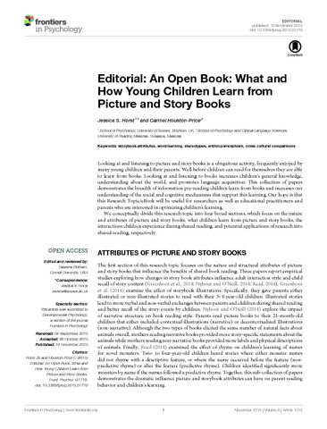 Looking at and listening to picture and story books is a ubiquitous activity, frequently enjoyed by many young children and their parents. Well before children can read for themselves they are able to learn from books. Looking at and listening to books increases children’s general knowledge, understanding about the world and promotes language acquisition. This collection of papers demonstrates the breadth of information pre-reading children learn from books and increases our understanding of the social and cognitive mechanisms that support this learning. Our hope is that this Research Topic/eBook will be useful for researchers as well as educational practitioners and parents who are interested in optimizing children’s learning. We conceptually divide this research topic into four broad sections, which focus on the nature and attributes of picture and story books, what children learn from picture and story books, the interactions children experience during shared reading, and potential applications of research into shared reading, respectively.