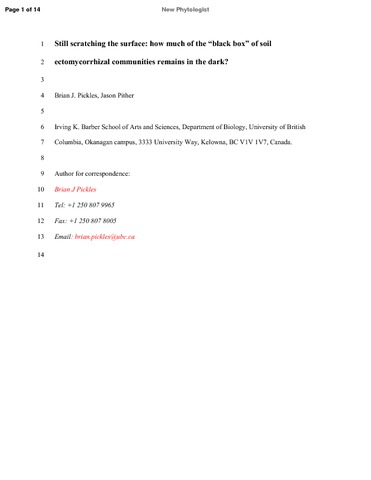 Pickles, B. J. orcid id iconORCID: https://orcid.org/0000-0002-9809-6455 and Pither, J. (2014) Still scratching the surface: how much of the ‘black box’ of soil ectomycorrhizal communities remains in the dark? New Phytologist, 201 (4). pp. 1101-1105. ISSN 0028-646X doi: 10.1111/nph.12616