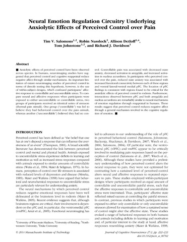 Salomons, T. V., Nusslock, R., Detloff, A., Johnstone, T. and Davidson, R. J. (2015) Neural emotion regulation circuitry underlying anxiolytic effects of perceived control over pain. Journal of Cognitive Neuroscience, 27 (2). pp. 222-33. ISSN 0898-929X doi: 10.1162/jocn_a_00702