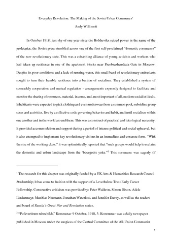 Willimott, A. (2016) Everyday revolution: the making of the Soviet Urban commune. In: Lindenmeyer, A., Waldron, P. and Read, C. (eds.) Book 2: Russia’s Home Front, 1914-1922: The Experience of War and Revolution. Russia's Great War & Revolution Series. Slavica Press, pp. 431-454. ISBN 9780893574260 (Volume 3: Russia's Home Front In War And Revolution)