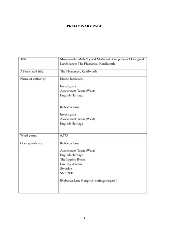 Jamieson, E. and Lane, R. (2015) Monuments, mobility and Medieval perceptions of designed landscapes: The Pleasance, Kenilworth. Medieval Archaeology, 59 (1). pp. 255-271. ISSN 0076-6097 doi: 10.1080/00766097.2015.1119394