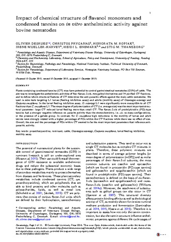 Desrues, O., Fryganas, C., Ropiak, H. M., Mueller-Harvey, I., Enemark, H. L. and Thamsborg, S. M. (2016) Impact of chemical structure of flavanol monomers and condensed tannins on in vitro anthelmintic activity against bovine nematodes. Parasitology, 143 (4). pp. 444-454. ISSN 0031-1820 doi: 10.1017/S0031182015001912