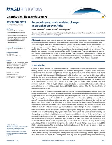 Multiple observational data sets and atmosphere-only simulations from the Coupled Model Intercomparison Project Phase 5 are analyzed to characterize recent rainfall variability and trends over Africa focusing on 1983–2010. Data sets exhibiting spurious variability, linked in part to a reduction in rain gauge density, were identified. The remaining observations display coherent increases in annual Sahel rainfall (29 to 43 mm yr−1 per decade), decreases in March–May East African rainfall (−14 to −65 mm yr−1 per decade), and increases in annual Southern Africa rainfall (32 to 41 mm yr−1 per decade). However, Central Africa annual rainfall trends vary in sign (−10 to +39 mm yr−1 per decade). For Southern Africa, observed and sea surface temperature (SST)-forced model simulated rainfall variability are significantly correlated (r~0.5) and linked to SST patterns associated with recent strengthening of the Pacific Walker circulation.