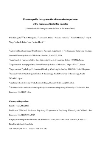 Yamagata, B., Murayama, K., Black, J., M., Hancock, R., Mimura, M., Yang, T. T., Reiss, A., L. and Hoeft, F. (2016) Female-specific intergenerational transmission patterns of the human corticolimbic circuitry. The Journal of Neuroscience, 36 (4). pp. 1254-1260. ISSN 1529-2401 doi: 10.1523/JNEUROSCI.4974-14.2016