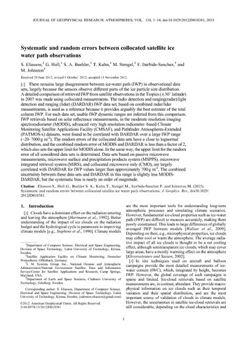 Eliasson, S., Holl, G., Buehler, S. A., Kuhn, T., Stengel, M., Iturbe-Sanchez, F. and Johnston, M. (2013) Systematic and random errors between collocated satellite ice water path observations. Journal of Geophysical Research: Atmospheres, 118 (6). pp. 2629-2642. ISSN 2169-8996 doi: 10.1029/2012JD018381