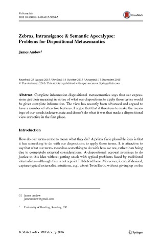 Andow, J. (2016) Zebras, intransigence & semantic apocalypse: problems for dispositional metasemantics. Philosophia, 44 (1). pp. 53-62. ISSN 1574-9274 doi: 10.1007/s11406-015-9684-5