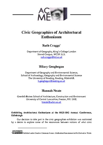 In this short intervention, we introduce the display and walking tour that formed our contribution to the ‘civic geographies’ exhibition and session at the Royal Geographical Society (with IBG) Annual Conference in July 2012. We then move on to explore the notion of ‘civic geographies’ in relation to the architectural enthusiasm, specifically a strong emotional attachment to buildings, exhibited by members of The Twentieth Century Society. In doing so, we suggest that a more critical account of the role of enthusiasm in the civic realm is required for two important reasons: first, because such groups can be understood to be doing geography beyond the academy in the civic realm; and second, because enthusiast knowledges and practices are active in the (re)constitution of civic landscapes of various kinds. Enthusiasts participate in caring for buildings, preserving heritage, making community spaces, as well as creating and curating local histories. An understanding of who is participating in making these civic geographies, why, how, and with what consequences, is therefore crucial.