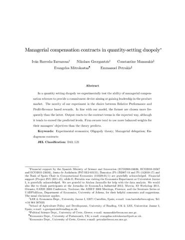 Barreda-Tarrazona, I., Georgantzis, N., Manasakis, C., Mitrokostas, E. and Petrakis, E. (2016) Endogenous managerial compensation contracts in experimental quantity-setting duopolies. Economic Modelling, 54. pp. 205-217. ISSN 0264-9993 doi: 10.1016/j.econmod.2015.12.028