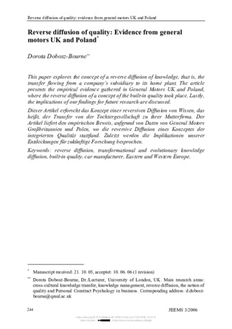 Dobosz-Bourne, D. orcid id iconORCID: https://orcid.org/0000-0002-9008-1769 (2006) Reverse diffusion of quality: evidence from general motors UK and Poland. Journal for East European Management Studies, 11 (3). pp. 244-266. ISSN 1862-0019