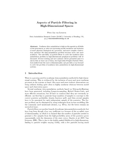 Van Leeuwen, P. (2015) Aspects of particle filtering in high-dimensional spaces. In: Ravela, S. and Sandu, A. (eds.) Dynamic data-driven environmental systems science. Lecture notes in computer science, 8964. Springer, Heidelberg, pp. 251-262. ISBN 9783319251370 doi: 10.1007/978-3-319-25138-7