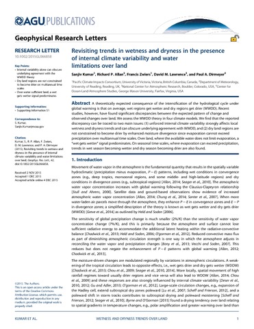 Kumar, S., Allan, R. P. orcid id iconORCID: https://orcid.org/0000-0003-0264-9447, Zwiers, F., Lawrence, D. M. and Dirmeyer, P. A. (2016) Revisiting trends in wetness and dryness in the presence of internal climate variability and water limitations over land. Geophysical Research Letters, 42 (24). 10,867-10,875. ISSN 0094-8276 doi: 10.1002/2015GL066858