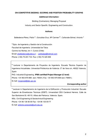 Ballesteros-Pérez, P., González-Cruz, M. C. and Cañavate-Grimal, A. (2013) On competitive bidding: scoring and position probability graphs. International Journal of Project Management, 31 (3). pp. 434-448. ISSN 0263-7863 doi: 10.1016/j.ijproman.2012.09.012