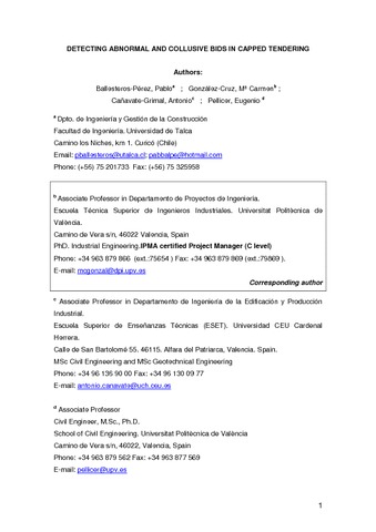 Ballesteros-Pérez, P., González-Cruz, M. C., Cañavate-Grimal, A. and Pellicer, E. (2013) Detecting abnormal and collusive bids in capped tendering. Automation in Construction, 31. pp. 215-229. ISSN 0926-5805 doi: 10.1016/j.autcon.2012.11.036