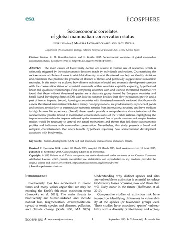Polaina, E., Gonzalez-Suarez, M. orcid id iconORCID: https://orcid.org/0000-0001-5069-8900 and Revilla, E. (2015) Socioeconomic correlates of global mammalian conservation status. Ecosphere, 6 (9). pp. 1-34. ISSN 2150-8925 doi: 10.1890/ES14-00505.1