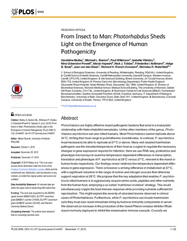 Mulley, G. ORCID: https://orcid.org/0000-0003-0650-478X, Beeton, M. L., Wilkinson, P., Vlisidou, I., Ockendon-Powell, N., Hapeshi, A., Tobias, N. J., Nollmann, F. I., Bode, H. B., van den Elsen, J., ffrench-Constant, R. H. and Waterfield, N. R.