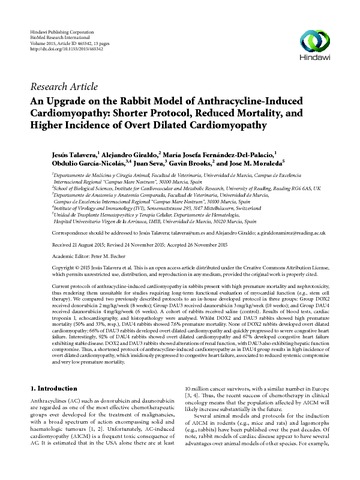 Talavera, J., Giraldo, A., Fernández-Del-Palacio, M. J., García-Nicolás, O., Seva, J., Brooks, G. and Moraleda, J. M. (2015) An upgrade on the rabbit model of anthracycline-induced cardiomyopathy: shorter protocol, reduced mortality, and higher incidence of overt dilated cardiomyopathy. BioMed research international, 2015. 465342. ISSN 2314-6133 doi: 10.1155/2015/465342