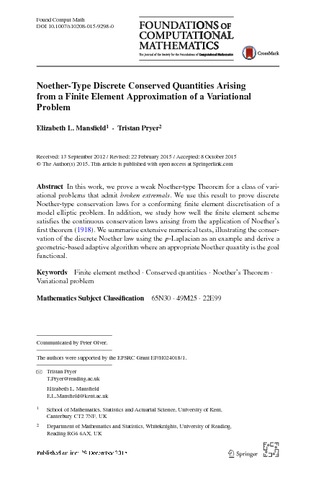 Mansfield, E. L. and Pryer, T. (2017) Noether-type discrete conserved quantities arising from a finite element approximation of a variational problem. Foundations of Computational Mathematics, 17 (3). pp. 729-762. ISSN 1615-3375 doi: 10.1007/s10208-015-9298-0