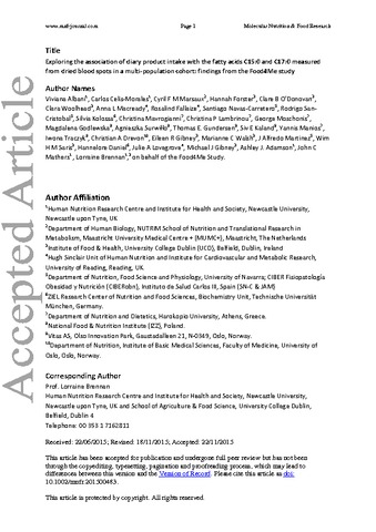 Albani Zambon, V., Celis-Morales, C., Marsaux, C. F. M., Forster, H., O'Donovan, C. B., Woolhead, C., Macready, A. L. orcid id iconORCID: https://orcid.org/0000-0003-0368-9336, Fallaize, R., Navas-Carretero, S., San-Cristobal, R., Kolossa, S., Mavrogianni, C., Lambrinou, C. P., Moschonis, G., Godlewska, M., Surwiłło, A., Gundersen, T. E., Kaland, S. E., Manios, Y., Traczyk, I., Drevon, C. A., Gibney, E. R., Walsh, M. C., Martinez, J. A., Saris, W. H. M., Daniel, H., Lovegrove, J. A. orcid id iconORCID: https://orcid.org/0000-0001-7633-9455, Gibney, M. J., Adamson, A. J., Mathers, J. C. and Brennan, L. (2016) Exploring the association of diary product intake with the fatty acids C15:0 and C17:0 measured from dried blood spots in a multi-population cohort: findings from the Food4Me study. Molecular Nutrition & Food Research, 60 (4). pp. 834-845. ISSN 1613-4125 doi: 10.1002/mnfr.201500483
