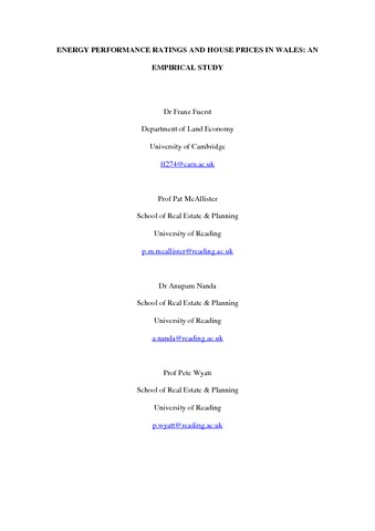Fuerst, F., McAllister, P., Nanda, A. and Wyatt, P. orcid id iconORCID: https://orcid.org/0000-0002-9091-2729 (2016) Energy performance ratings and house prices in Wales: an empirical study. Energy Policy, 92. pp. 20-33. ISSN 0301-4215 doi: 10.1016/j.enpol.2016.01.024