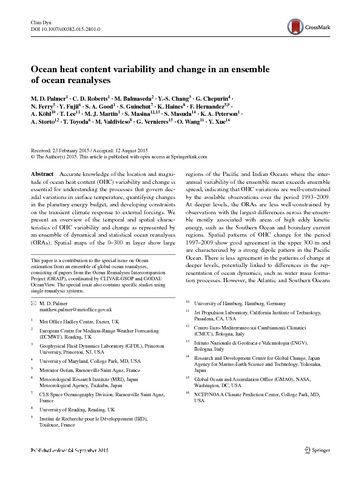 Palmer, M. D., Roberts, C. D., Balmaseda, M., Chang, Y.-S., Chepurin, G., Ferry, N., Fujii, Y., Good, S. A., Guinehut, S., Haines, K. orcid id iconORCID: https://orcid.org/0000-0003-2768-2374, Hernandez, F., Kohl, A., Lee, T., Martin, M. J., Masina, S., Masuda, S., Peterson, K. A., Storto, A., Toyoda, T., Valdivieso, M. orcid id iconORCID: https://orcid.org/0000-0002-1738-7016, Vernieres, G., Wang, O. and Xue, Y. (2017) Ocean heat content variability and change in an ensemble of ocean reanalyses. Climate Dynamics, 49 (3). pp. 909-930. ISSN 0930-7575 doi: 10.1007/s00382-015-2801-0