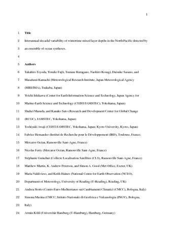 Interannual-decadal variability of wintertime mixed layer depths in the North Pacific detected by an ensemble of ocean syntheses.