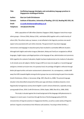 Curdt-Christiansen, X.-L. (2016) Conflicting language ideologies and contradictory language practices in Singaporean bilingual families. Jounal of Multilingual and Multicultural Development, 37 (7). pp. 694-709. ISSN 0143-4632 doi: 10.1080/01434632.2015.1127926
