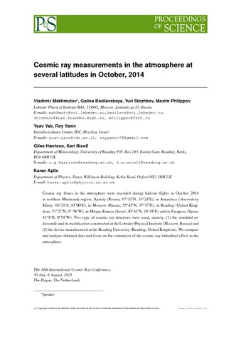 Makhmutov, V., Bazilevskaya, G., Stozhkov, Y., Philippov, M., Yair, Y., Yaniv, R., Harrison, G. orcid id iconORCID: https://orcid.org/0000-0003-0693-347X and Nicoll, K. orcid id iconORCID: https://orcid.org/0000-0001-5580-6325 (2016) Cosmic ray measurements in the atmosphere at several latitudes in October, 2014. In: The 34th International Cosmic Ray Conference, 30 July - 6th August 2015, The Hague, The Netherlands.
