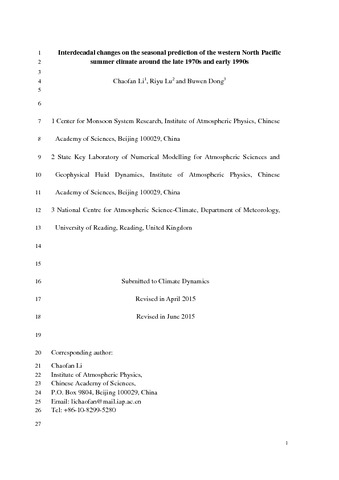 Interdecadal changes on the seasonal prediction of the western North Pacific summer climate around the late 1970s and early 1990s.