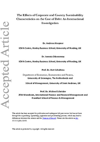 Hoepner, A., Oikonomou, I., Scholtens, L. J. R. and Schröder, M. (2016) The effects of corporate and country sustainability characteristics on the cost of debt: an international investigation. Journal of Business Finance & Accounting, 43 (1-2). pp. 158-190. ISSN 1468-5957 doi: 10.1111/jbfa.12183