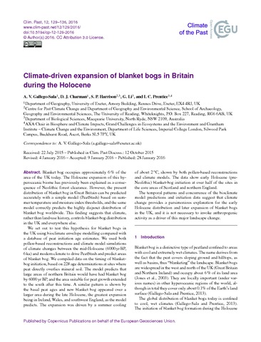 Blanket bog occupies approximately 6% of the area of the UK today. The Holocene expansion of this hyperoceanic biome has previously been explained as a consequence of Neolithic forest clearance. However, the present distribution of blanket bog in Great Britain can be predicted accurately with a simple model (PeatStash) based on summer temperature and moisture index thresholds, and the same model correctly predicts the highly disjunct distribution of blanket bog worldwide. This finding suggests that climate, rather than land-use history, controls blanket-bog distribution in the UK and everywhere else. We set out to test this hypothesis for blanket bogs in the UK using bioclimate envelope modelling compared with a database of peat initiation age estimates. We used both pollen-based reconstructions and climate model simulations of climate changes between the mid-Holocene (6000 yr BP, 6 ka) and modern climate to drive PeatStash and predict areas of blanket bog. We compiled data on the timing of blanketbog initiation, based on 228 age determinations at sites where peat directly overlies mineral soil. The model predicts that large areas of northern Britain would have had blanket bog by 6000 yr BP, and the area suitable for peat growth extended to the south after this time. A similar pattern is shown by the basal peat ages and new blanket bog appeared over a larger area during the late Holocene, the greatest expansion being in Ireland,Wales, and southwest England, as the model predicts. The expansion was driven by a summer cooling of about 2 °C, shown by both pollen-based reconstructions and climate models. The data show early Holocene (pre- Neolithic) blanket-bog initiation at over half of the sites in the core areas of Scotland and northern England. The temporal patterns and concurrence of the bioclimate model predictions and initiation data suggest that climate change provides a parsimonious explanation for the early Holocene distribution and later expansion of blanket bogs in the UK, and it is not necessary to invoke anthropogenic activity as a driver of this major landscape change.