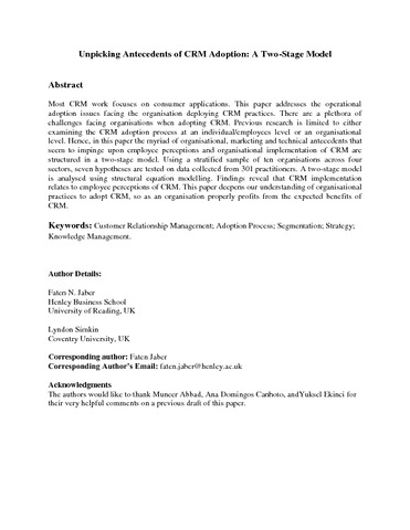 Jaber, F. and Simkin, L. (2017) Unpicking antecedents of CRM adoption: a two-stage model. Journal of Strategic Marketing, 25 (5-6). pp. 475-494. ISSN 1466-4488 doi: 10.1080/0965254X.2016.1149212